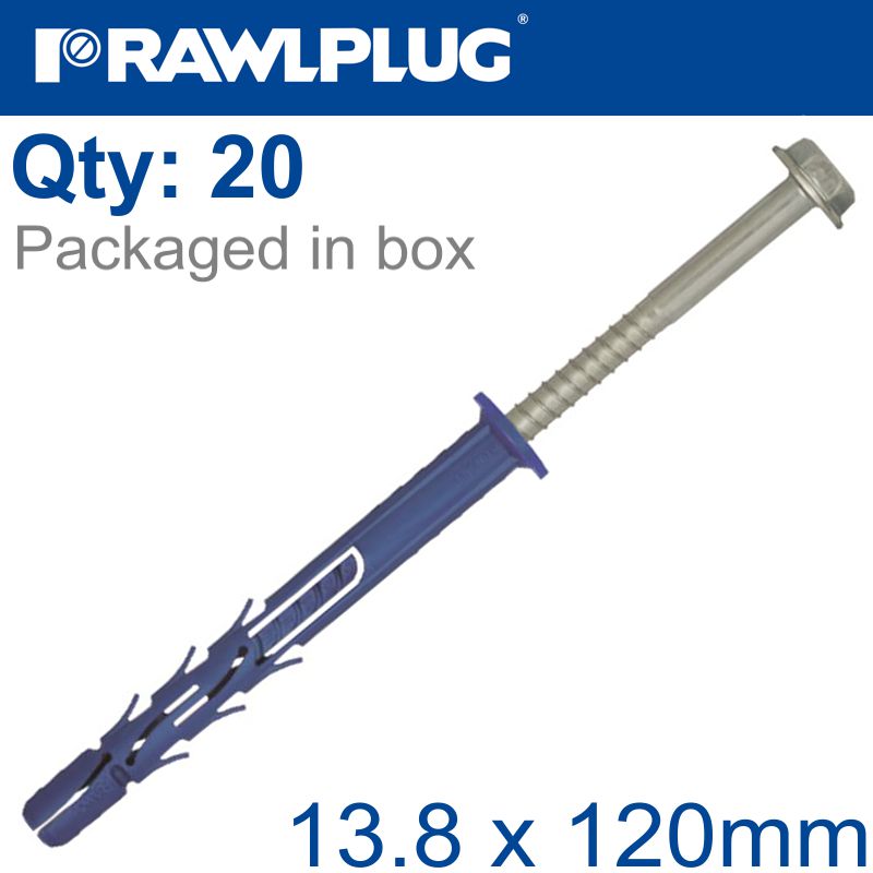 RAWLPLUG NYL FRAME FIXING ZP + COLLAR HEX SCREW 13.8MMX120MM X20 -BOX RAW R-FF1-N-14K120