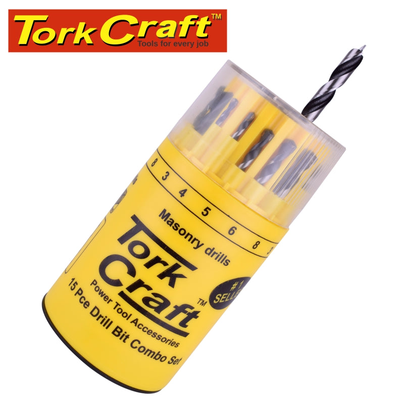 TORK CRAFT DRILL BIT 15PC SET COMBO WOOD + MASONRY + HSS IN PLASTIC CONTAINER NR08015